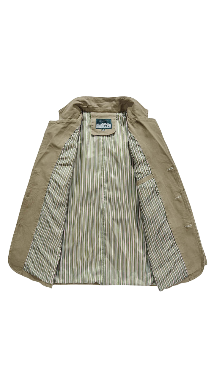 Cierre frontal con botones clásicos, equilibrio entre formal y relajado.